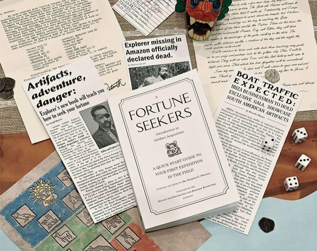 The core rulebook is a 132 page book designed to look like an archaeological academic journal titled A Fortune Seeker's Introduction to Artifact Acquisition, written in 1936, and passed down from owner to owner until it reaches you. Scribbled in the margins and tucked between the pages, you may find notes, diagrams, maps, or other ephemera left behind from those who had the book before you.