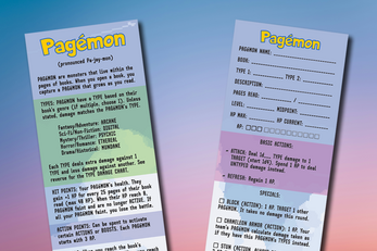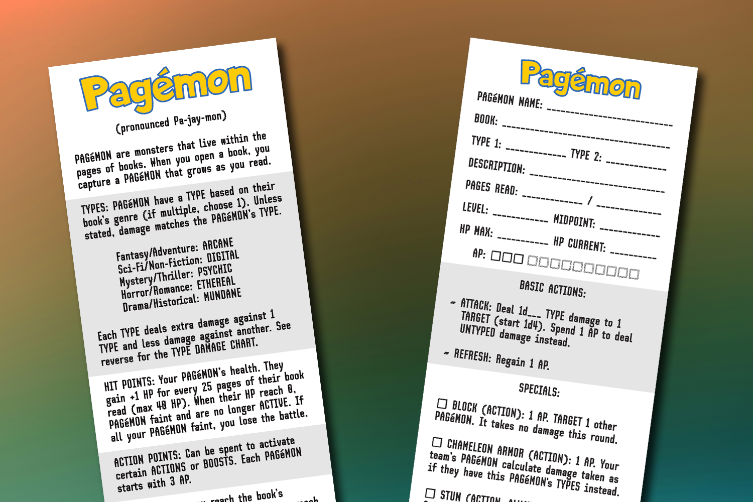 Each 2"x8" bookmark contains all of the rules needed to play on one side and a single Pagémon character sheet on the reverse. Bookmarks are available in full color or ink-friendly versions!